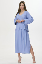 Комплект женский, состоящий из туники и брюк. Туника А-образного силуэта с центральной застежкой на планку до подреза на 3 декоративные петли-пуговицы. Перед с нагрудной вытачкой и фигурными подрезами. Спинка с горизонтальной кокеткой и двумя складками. В боковых швах обработаны разрезы. Низ переда ассиметричен и слегка разведен. Рукава втачные одношовные длиной 3/4 с защипом, имитирующим манжет. Воротник-стойка. Брюки классического кроя, зауженные к низу с притачным поясом сзади на резинке. Застежка на тесьму-молнию в среднем шве передних половинок и 1 петлю-пуговицу по поясу. На брюках заутюжены канты.