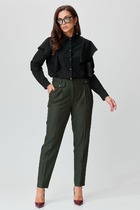 Жакет укороченный, на подкладке, с центральной бортовой застежкой на 5 петель-пуговиц. Перед с отрезным бочком и нагрудной вытачкой. Спинка со средним швом. Горловина овальной формы. Рукава 3-шовные с тремя складками по среднему шву рукава и фигурнооформленным низом, укороченные.