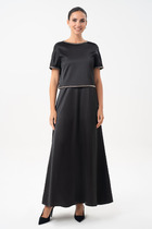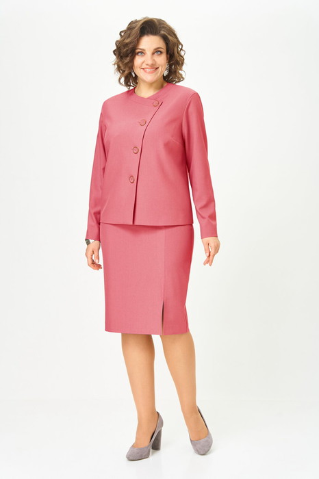 Костюм женский двухпредметный, состоящий из жакета и юбки. Жакет полуприлегающего силуэта со слегка спущеной линией плеча, на подкладке, со смещенной застежкой на 3 пели-пуговицы по линии борта 1 потайной петлей-пуговицей и нагрудными вытачками, выходящими из боковых швов. Горловина с фигурной планкой по переду и спинке. Спинка со средним швом. Рукав втачной длинный двухшовный. Изделие со съемным поясом. Юбка- карандаш длиной за колено, зауженная к низу, с кокетками со шлевками. Переднее полотнище с имитацией карманов и рельефным швом, заканчивающимся разрезом. Заднее полотнище со средним швом, в котором обработана застежка на 2 петли-пуговицы по кокетке и потайная тесьма-молния.