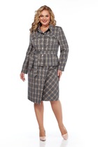 Костюм женский двухпредметный, состоящий из укороченного жакета на подкладке и брюк. Жакет с центральной бортовой застёжкой на две петли-пуговицы до линии перегиба лацкана прямого силуэта с нагрудной вытачкой, выходящей из бокового шва и резинкой по низу переда и частично по спинке. На спинке настрочен декоративный эменет. Рукава втачные длинные одношовные. Воротник пиджачного типа. Брюки классического кроя прямого силуэта со стрелками и притачным поясом на широкой резинке. Застёжка на потайную тесьму-молнию в боковых швах. На поясе настрочены шлёвки для съёмного пояса, застёгивающегося на 1 петлю-пуговицу. В брюках обработаны карманы, наклонные к боковому шву. Длина жакета по спинке - 49 см. Длина рукава - 60,5 см. Длина брюк - 100 см.