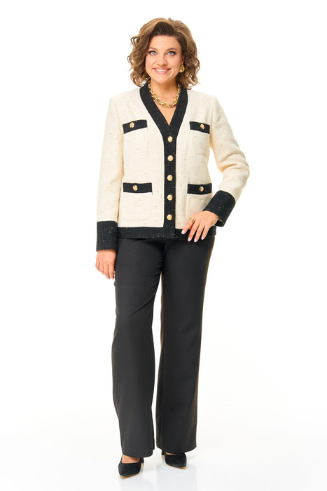 Жакет свободного покроя с естественной линией плеча на подкладке. Спинка со средним швом. Перед с нагрудными вытачками и накладными карманами.По переду обработана отрезная планка плавно переходящая в воротник стойку. Вырез горловина V-образной формы. Застежка центрально-бортовая на петли-пуговицы. Рукав двухшовный длинный с отрезной манжетой.