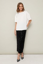 Комплект состоит из топа и брюк. Топ прямого силуэта с естественной линией плеча. По переду выполнены нагрудные вытачки.Горловина округлой формы. В горловине спинки выполнен вырез "капля" с застёжкой на навесную петлю и пуговицу.Верхний слой топа выполнен из полотна с "ресничками". Нижний слой топа - из трикотажной подкладки.Рукав длиной до линии локтя. Брюки расширенные к низу типа "палаццо" с центральной застёжкой на молнию и петлю-пуговицу. В боковых швах карманы с отрезным бочком.Пояс притачной с резинкой по задней части пояса. В комплект входит съёмный цветок с перьями контрастного цвета.