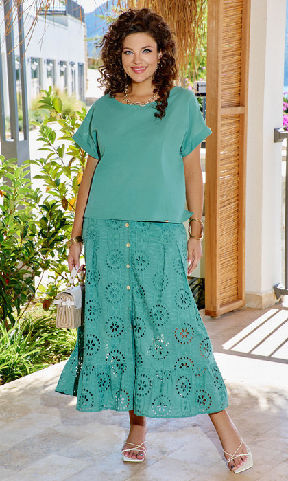 Костюм женский, состоящий из блузы и юбки, выполнен в нежнейшем оттенке «яйца-дрозда» отлично подходит для летнего сезона. Этот мягкий, почти пастельный цвет создаёт атмосферу лёгкости и свежести, а деликатный крой придаёт образу естественную элегантность.