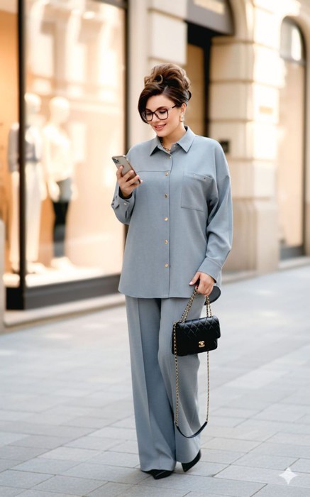 Костюм женский, состоящий из рубашки и брюк. Рубашка «оверсайз» свободно ниспадает с плеч, её мягкие формы подчёркивают лёгкую небрежность, но не лишены чёткости линий. По переду центральная застёжка на декоративные кнопки по планке, воротник рубашечного типа. По правой детали переда отрезная кокетка, по левой накладной карман с отделочным декоративным элементом в виде хольнитен от верха кармана. Спинка с декоративным элементом в виде притачной вставки переходящей в отлетной хлястик с отделочной шлёвкой. В качестве дополнительной отделки декоративные кнопки и хольнитены и кнопки по хлястику. Линия плеча в рубашке спущенная. Рукав втачной, длинный с заложенной складкой по низу и притачной манжетой с застёжкой на декоративные функциональные кнопки. Низ в рубашке фигурной формы. В боковых швах от низа разрезы. Прямые брюки с застроченными стрелками выстроены по фигуре. По переду застежка на тесьму молнию в гульфике и пуговицу в поясе. По переду брюк наклонные карманы. Пояс притачной со вставкой эластичной тесьмы резинки в «бочках», что обеспечивает комфортную посадку на фигуру.