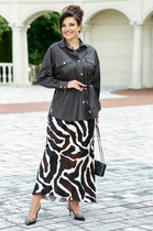 Комплект женский, состоящий из блузки и юбки. Блузка свободного силуэта с центральной застёжкой на декоративные кнопки по планке, воротник рубашечного типа. По переду блузки декоративны клапана с отделкой в виде декоративной кнопки. По спинке притачная кокетка. Линия плеча спущенная. Рукав втачной, длинный с заложенной складкой по низу и притачной манжетой застёгивающейся на декоративные кнопки. Низ ассиметричный с небольшими разрезами от низа в боковых швах.