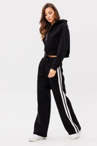 Костюм женский, состоящий из блузки и брюк-кюлот. Блузка свободного силуэта. Горловина округлой формы с отложным воротником на стойке фигурной формы переходящим на спинку из отделочной ткани. По спинке вырез капелька с застёжкой на пуговицу, спинка со средним швом. Рукав цельнокроены с со сборкой на притачной манжет по низу. Боковой шов слегка переходит на перёд. Низ в блузке ассиметричный с разрезами в боковых швах. Брюки-кюлоты свободного силуэта, длиной 7/8 расширяются к низу. Пояс притачной со вставкой эластичной тесьмы-резинки, которая обеспечивает максимально удобную посадку на любой тип фигуры. По переду брюк от верха застрачиваются складки. В задней части брюк застёжка на тесьму-молнию в шве и пуговицу в поясе. В боковых швах брюк- карманы.