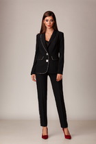 Блузка свободного силуэта, удлинённая, с центральной застёжкой на молнию по центру переда, воротником рубашечного типа. По переду блузки ассиметричные отлетные планки, декоративные накладные карманы с клапаном с фигурным входом в карман, а так же декоративная функциональная планка от головины. По спинке блузки отрезная кокетка с вертикальными декоративными рельефами, отлетной планкой. Линия плеча спущенная. Рукав втачной, длинный с декоративным локтевым швом, заложенной складкой по низу и притачной манжетой по низу. В боковых швах блузки разрезы. Брюки прямого силуэта, по переду застежка на тесьму молнию в гульфике и пуговицу в поясе. По переду брюк наклонные карманы. Пояс притачной со шлёвками, вставкой эластичной тесьмы резинки в «бочках» пояса и вставкой фигурной кокетки по задним деталям брюк. По задним половинкам брюк накладные карманы. Текстура денима с легкой потертостью. Длина блузки 75 см (р 50-54), 75,5 см (р 56-60). Длина рукава 74 см (р 50-54), 75,5 см (р 56-60) см. Длина брюк по боковому шву 98 см.