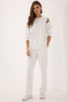 Костюм женский из плотного гладкокрашеного трикотажного полотна "кулирка", состоящий из футболки и шорт. Футболка - свободного покроя, с удлиненными плечевым и швами, короткими втачными рукавами и горловиной овальной формы, обработанной втачной планкой. В нижней части переда слева настрочен декоративный элемент прямоугольной формы. По горловине проложена отделочная строчка. Шорты - классического покроя, на притачном поясе с эластичной тесьмой внутри и карманами в боковых швах. Для регулирования степени прилегания шорт по талии в пояс вставлен шнурок, продетый через два отверстия в соединительных швах в центре пояса.