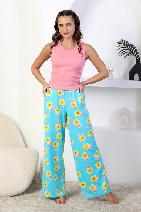 Костюм женский, состоящий ихз майки и брюк. Майка - из трикотажного эластичного гладкокрашенного полотна "кашкорсе" классического покроя с окантованными основным материалом горловиной и проймами. Брюки - из трикотажного полотна "кулирка" с набивным цветочным рисунком, широкие, прямые,на притачном поясе с эластичной тесьмой внутри и карманами в боковых швах, входы в которые окантованы основным материалом.