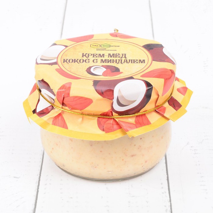 Крем-мёд с кокосом и миндалём - не только вкусный, но и полезный продукт, он дает много энергии, содержит повышенное количество ценных и легко усваиваемых растительных жиров и белков.  Крем-мёд в отличие от обычного мёда не засахаривается, всегда сохраняется в консистенции, удобной для намазывания на оладьи, блинчики или хлеб, тосты. Такой мёд идеально подходит для детей. Это прекрасная альтернатива ненатуральным сладостям. Также крем-мёд - отличный вариант для подарка. Этот мед имеет нежный и приятный вкус кокоса и миндаля. Крем-мёд можно использовать в качестве ингредиента при приготовлении сладких соусов, он идеально подходит для прослойки тортов и пирожных.  Состав: крем мёд цветочный, кокосовая стружка, миндаль колотый.