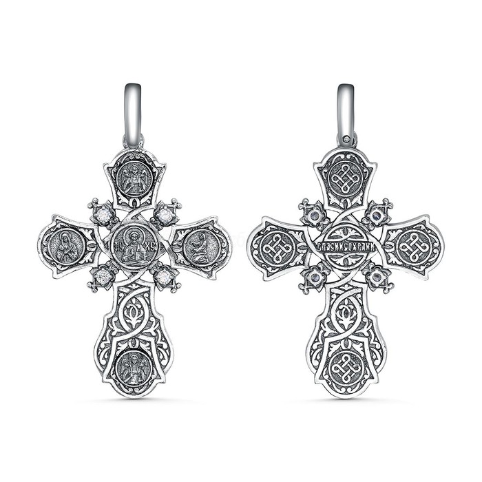 Крест из чернёного серебра с фианитами - Лики святых 5,5 см
