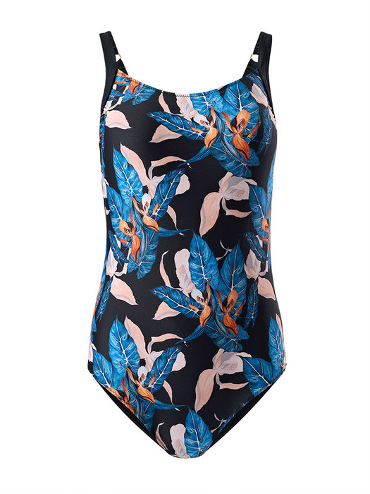 Слитный купальник из микрофибры с растительным принтом. Материал быстро высыхает, приятно ощущается на теле и устойчив к воздействию хлора и ультрафиолета. Купальник полностью на подкладке и не просвечивает.