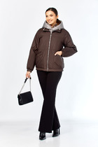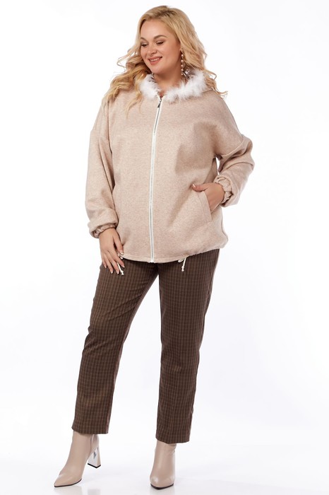 Джемпер женский свободного силуэта, на подкладке,  с функциональными карманами  по переду, застежка молния, по низу изделия кулиска  со шнурком, капюшон украшен боа. Длина джемпера 60 см.