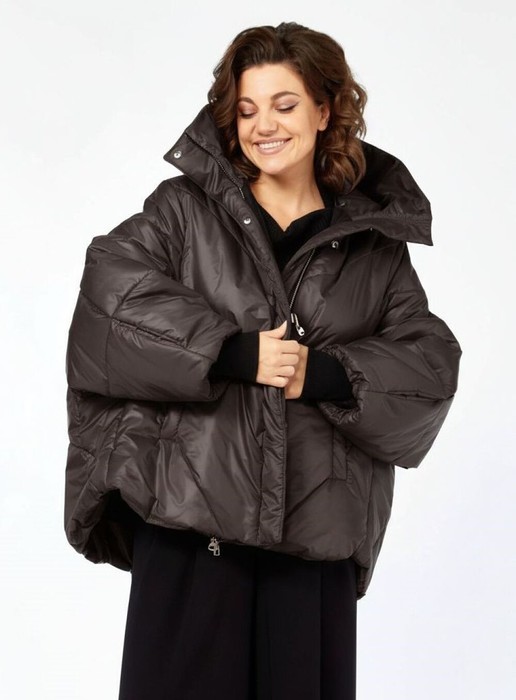 Куртка женская, свободного кроя с центральной застежкой на тесьму-молнию и кнопу-застежку на потайные кнопки. По переду прорезные карманы с втачной листочкой. Спинка присборена по низу на кулису. Рукав втачной, одношовный с застроченными складками от оката до низа по линии стяжки. Низ рукава присборен на резинку, по низу манжет из отделочной ткани-довяз. Капюшон с центральной частью и отделочной деталью по отлету, присборенной на кулису. В качестве отделки используется фурнитура. Наполнитель синтепон. Температурный режим до -10 градусов.