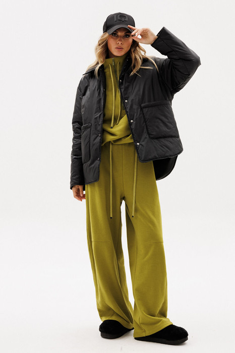 Куртка выполнена из плащевой ткани с утеплителем Isosoft. Куртка прямого силуэта, длиной до линии бедер. Спереди прорезные карманы и центральная бортовая застежка на кнопки. Спинка цельная. Воротник стояче-отложной. Плечевой шов удлинен. Рукав рубашечного покроя , одношовный. Низ куртки фигурной формы. Спинка чуть длинее. Куртка на притачной по низу подкладке.