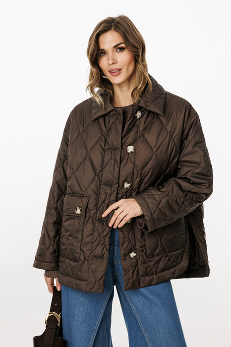 Куртка выполнена из плащевой ткани, простеганной с Isosoft. Куртка прямого силуэта, длиной до линии бедер. Застежка центральная бортовая на пришивные пуговицы. Спереди накладные карманы с клапанами. Спинка цельная. Воротник стояче-отложной. Рукав втачной, двухшовный. Плечевой шов спущен. Пройма углублена. Спинка длиннее переда. В боковых швах фигурные разрезы.