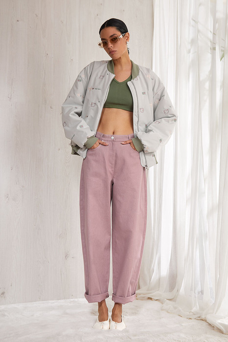 Стильная, объемная,   укороченная куртка   в стиле Casual,  выполнена из курточной ткани  OXFORD. Изделие  прямого силуэта,  на Вискозной авторской подкладке.  Изделие на молнии.   По переду прорезные карманы с листочками.  Спинка прямая.  Низ изделия на плотной   широкой манжете.  Рукав спущенный.  Низ рукава на  манжете. Горловина круглая. По горловине вставлена притачная планка из отделочной ткани(довяз).