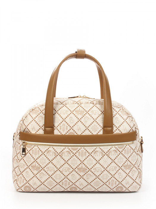 Сумка дорожная выполнена из экокожи «канва». Детали: 2 ручки по 60 см., 1 длинный регулируемый ремень на карабинах. Внутри изделия: 1 отделение на молнии, 1 карман на молнии, 2 открытых кармана. Снаружи изделия: 2 кармана на молнии спереди изделия, 1 карман на молнии сзади изделия. Брендированная подкладка из хлопка. Металлическая брендированная фурнитура золотистого цвета.