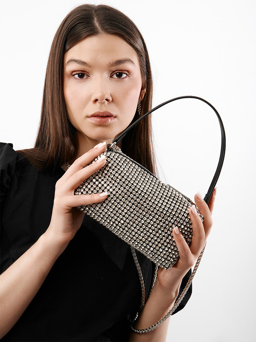 Сумка женская выполнена из текстиля, декорирована стразами, с элементами эко кожи. Детали: 1 короткая ручка 35 см, 1 длинный ремешок на плечо из цепочки 120см. Внутри изделия: 1 отделение на молнии, 1 открытый карман. Брендированная подкладка из хлопка. Металлическая брендированная фурнитура серебристого цвета. В комплекте фирменный пыльник.