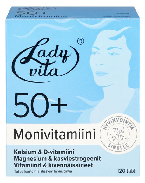 Ladyvita 50+. Витаминно-минеральный комплекс для женщин 50+. 120 табл.Комплекс Ladyvita 50+ разработан с учетом новейших рекомендаций для женщин старше 50-ти лет. С возрастом потребности организма женщины в витаминах и минералах изменяются. В частности в этот период сокращается костная масса. Особенно сильное снижение костной массы происходит в период менопаузы, когда собственное производство организмом эстрогена уменьшается. Поэтому для женщин старше 50 лет особенно важен источник кальция, в дополнении к обычному рациону питания, а также витамин D3, для более полного усвоения кальция. Ladyvita 50+ содержит кальций и витамин D3 в необходимом количестве. В состав комплекса входят также железо, в количестве рекомендованном финскими специалистами по питанию, а также соевые фитоэстрогены, cпособствующие снижению симптомов менопаузы. В состав Ladyvita 50+ включены витамин А, витамины группы B (В1, В2, В6, В12), фолиевая кислота, ниацин, биотин, пантотеновая кислота, витамины С, Е и К, магний, цинк, медь, марганец, хром и селен. Рекомендуемая суточная доза: 3 таблетки в день. Принимать во время или после еды. В 3 таблетках Ladyvita 50+ содержится: Соевые фитоэстрогены - 25 мг, Витамин A - 400 мкг, Витамин D3 - 10.