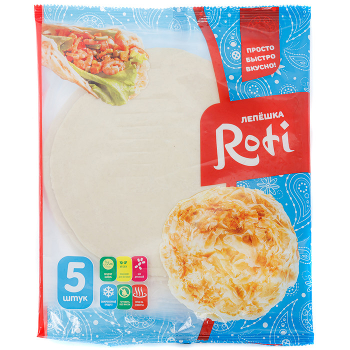 Замороженная лепешка Роти, после приготовления может быть как самостоятельным блюдом,так и основой многих блюд (сэндвичей, пиццы, роллов, различных закусок и блюд).