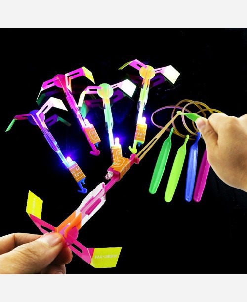 При правильном сложении лопасти (как на картинке) конструкция взлетает на высоту 6-10 метров, а затем плавно спускается вниз, светясь разными цветами. Завораживающее зрелище. Интересная забава для детей и взрослых. Запускается подобно рогатке- с помощью резинки (входит в комплект).