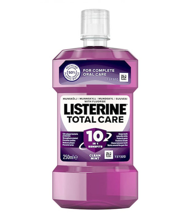 LISTERINE® Total Care Ополаскиватель для полости рта - Предотвращает образование зубного камня - Уменьшает зубной налет - Защищает десны и освежает дыхание на срок до 12 часов - Содержит фтор, который укрепляет зубы и защищает от кариеса Состав: вода, спирт, сорбит, полоксамер 407, бензойная кислота, ароматизатор, хлорид цинка, эвкалиптол, сахарин натрия, фторид натрия, метилсалицилат, тимол, ментол, сукралоза, пропиленгликоль, CI 16035, CI 42090. Содержит: фторид натрия 0,07% (300 ppm F).
