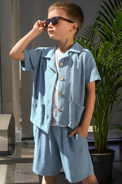 Лёгкий, как летний бриз, и стильный во всем — льняной костюм для мальчика готов даже к жарким дням. Синий цвет и свободный крой добавляют непринуждённости и комфорта в каждом движении.