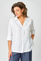Блуза прямого силуэта. Перед и спинка цельнокроенные. Горловина обработана воротником-стойской. Проймы обработаны бейкой из основного полотна. Низ обработан вподгибку.