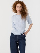 Плечо спущено, пройма углублена, рукав втачной удлиненный. По плечу и пройме проложены отделочные строчки. Джемпер удлинен, с разрезами в боковых швах.