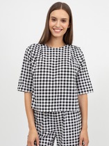 Укороченная женская блузка А-образного силуэта из хлопкового поплина – плотного текстильного полотна, которое отлично держит форму. Сзади блузка застегивается на пуговицы. Рукава широкие и прямые, длиной до локтя. Линия плеча удлиненная, с необычной складочкой. Идеально решение для ваших стильных образов!
