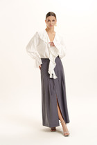 Плечо слегка спущено, рукав втачной, длинный. По низу манжета отрезная, широкая, с разрезом. Спинка цельнокроеная.