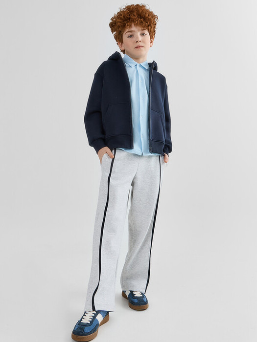 Брюки прямые свободные, посадка средняя. Пояс отрезной, с эластичной тесьмой внутри (внутренняя 50мм 50RV). С внешней стороны пробиты петли и вставлен шнур 10PX-2. В боковых швах обработаны карманы. По бокам лампасы из кулирки.