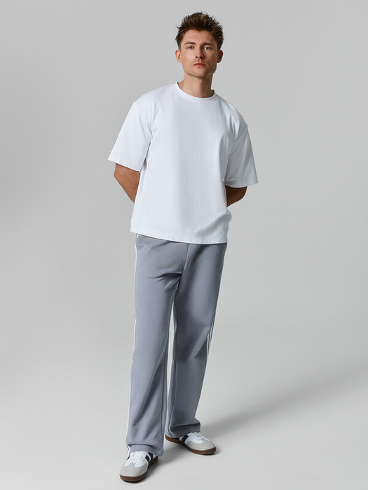 Брюки прямые. Боковые карманы в боковом шве. Пояс с эластичной тесьмой внутри. Шнур 10 PXC-1 с застроченными концами выводится через петли на внутренней части пояса.В области бокового шва лампасы.Нижние срезы брюк обработаны швом вподгибку на 2х игольной плоскошовной машине.
