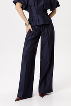 Брюки прямые свободные, посадка средняя. Пояс цельнокроеный с эластичной тесьмой внутри (20мм 20RV). С внутренней стороны пояса пробиты петли и втянут шнур-бейка из основного полотна. На деталях переда обработаны карманы-хулиганы. Подкладка карман из основного полотна. На правой детали переда имитация гульфика. Нижние срезы обработаны швом вподгибку с закрытым срезом.