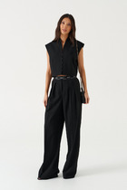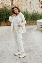 Брюки прямые, свободного силуэта. Посадка средняя, сиденье опущено. Пояс цельнокроеный с эластичной тесьмой внутри (вн. 20мм 20RV). В боковых швах обработаны карманы. Подкладка кармана из основного полотна. Нижние срезы обработаны швом вподгибку.