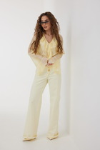 Брюки прямого силуэта, свободные. Посадка средняя. Пояс цельнокроеный с эластичной тесьмой внутри (40мм 40RV). Брюки с боковыми швами. На левой половинке переда проложена декоративная строчка - имитация гульфика. Нижние срезы обработаны швом вподгибку.