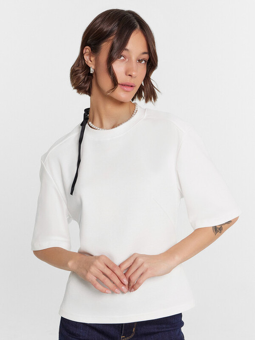 Джемпер женский полуприлегающего силуэта из трикотажного полотна интерлок. Горловина круглой формы обработана обтачкой из рибаны. Плечевой шов смещен в сторону переда. Плечо спущено, пройма углублена. Рукав втачной, широкий, короткий. На детали переда застрочены вытачки. Спинка со средним швом и отрезной кокеткой. Нижнтие срезы рукавов и джемпера обработаны швом вподгибку.
