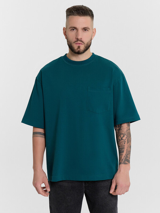 Футболка свободная укороченная, оверсайз. Горловина округлой формы обработана обтачкой из рибаны. Рукава втачные, корткие. Линия плеча спущена. На детали переда накладной карман (мод 111899-1). Нижние срезы футболки и рукавов обработаны швом вподгибку.