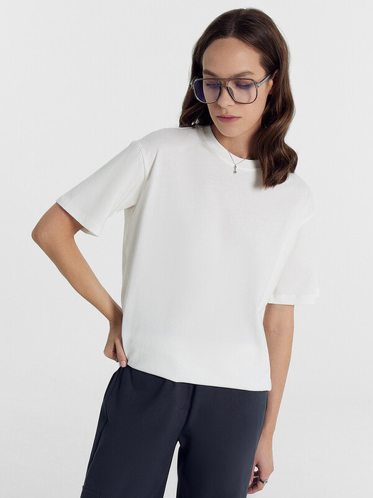 Хлопковая футболка свободного силуэта из трикотажной кулирки. Вырез круглой формы. Свободу движений гарантируют спущенная линия плеча и углубленная пройма. Рукава широкие, чуть выше локтя. Стильная модель!