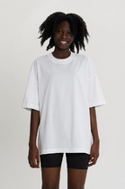 Футболка силуэта оверсайз из трикотажного полотна кулирка. Горловина круглой формы, обтачка горловины из рибаны. Шов горловины спинки закрыт бейкой из основного полотна.