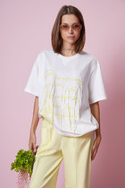 Нижние срезы футболки и рукавов обработаны швом вподгибку.
