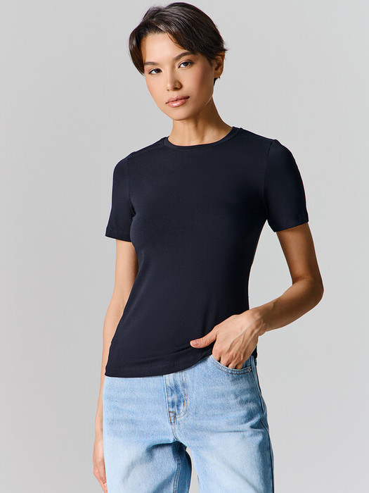 Футболка прилегающего силуэта. Горловина круглой формы обработана обтачкой из основного полотна. Рукава втачные, короткие. Нижние срезы футболки и рукавов обработаны швом вподгибку.