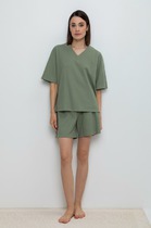 Халат прямой, короткий. Горловина V-образной формы. Рукава втачные длинные. По боковым швам в районе талии настрочены шлевки и вставлен пояс из основного полотна. На уровне талии притачаны завязки из основного полотна для фиксации полы халата. Срезы борта и горловины обработаны обтачками. Нижние срезы халата и рукавов обработаны швом вподгибку.