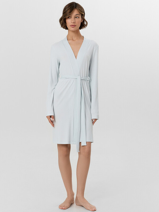 Халат прямой, короткий. Горловина V-образной формы. Рукава втачные длинные. По боковым швам в районе талии настрочены шлевки и вставлен пояс из основного полотна. На уровне талии притачаны завязки из основного полотна для фиксации полы халата. Срезы борта и горловины обработаны обтачками. Нижние срезы халата и рукавов обработаны швом вподгибку.