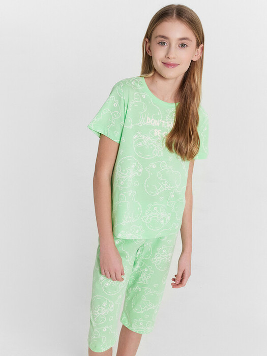 Пижама для девочек, выполненная из нежной хлопковой кулирки, обеспечит вашему ребенку комфорт и уют в течение всей ночи. Свободная футболка с короткими рукавами и круглой горловиной не сковывает движения и создаёт ощущение легкости. Бриджи прямого силуэта длиной чуть ниже колена с эластичным поясом обеспечат удобную посадку и свободу движений. Этот комплект станет прекрасным выбором для комфортного сна и отдыха.