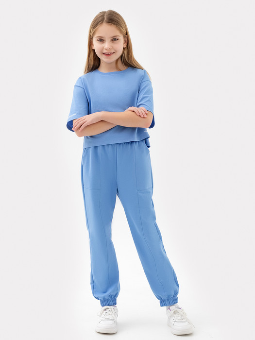 Универсальный комплект для девочек состоит из футболки и брюк. Футболка из кулирного полотна, укороченная, прямого силуэта. Линия плеча спущена. Рукав втачной, короткий. Горловина круглой формы из рибаны. Брюки прямого силуэта из футера. Посадка высокая. Отрезной пояс с эластичной тесьмой внутри. На передних половинках выполнены накладные карманы. Стильная, а главное удобная модель, которая точно понравится вашей малышке. Натуральный материал изделия гарантирует комфорт в любой ситуации. Широкий размерный и цветовой ряд. Рекомендуем!