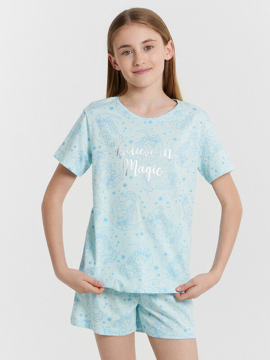 Комплект для девочки, состоит из футболки с короткими рукавами и шорт из натурального хлопка. Подходит для сна и отдыха. Материал очень приятный к телу, хорошо пропускает воздух, что позволяет чувствовать себя комфортно даже в жаркую погоду. Идеальный выбор детской одежды для дома. Стильно, красиво, комфортно. Футболка декорирована интересным принтом, шортики однотонные. Широкий размерный ряд, базовые и яркие расцветки, модели с принтами, рисунками и печатями. Купите детскую пижаму для девочки от Mark Formelle, порадуйте ребенка красивым и стильным подарком!