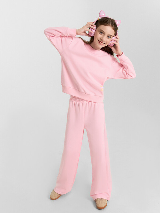 Комплект состоит из свитшота и брюк. Свитшот прямого силуэта, перед и спинка цельнокроенные. Круглый вырез горловины.