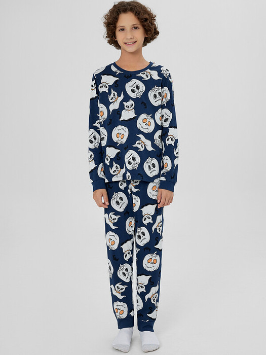 Синий комплект для мальчиков с забавным узором привидений — это удобная пижама для комфортного сна. Модель состоит из джемпера с длинными рукавами и брюк на резинке.